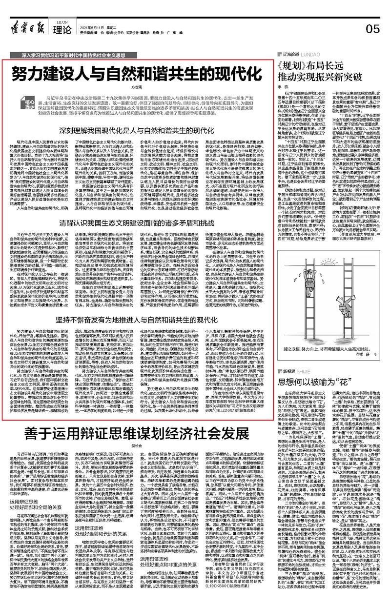 5月11日,《辽宁日报》刊载了苏州大学中国特色城镇化研究中心特聘研究员方世南教授的观点文章,文章从现代化是人与自然和谐共生的现代化、清醒认识我国生态文明建设面临的诸多矛盾和挑战、坚持不懈奋发有为地推进人与自然和谐共生的现代化三个方面为我们深刻理解我国现代化的重要特征,清醒认识我国生态文明建设面临的诸多矛盾和挑战,站在人与自然和谐共生的高度来谋划经济社会发展,坚持不懈奋发有为地推进人与自然和谐共生的现代化,提供了思想指导和实践遵循。