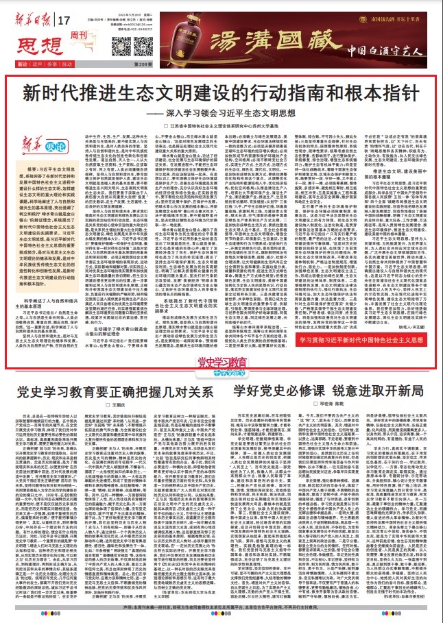 5月18日,《新华日报》刊载了苏州大学中国特色城镇化研究中心研究员田芝健教授的观点文章,文章指出习近平生态文明思想科学阐述了人与自然和谐共生的基本原理、生动揭示了绿水青山就是金山银山的辩证理念、系统提出了新时代中国特色社会主义生态文明建设的实践要求,是推进生态文明、建设美丽中国的根本遵循。