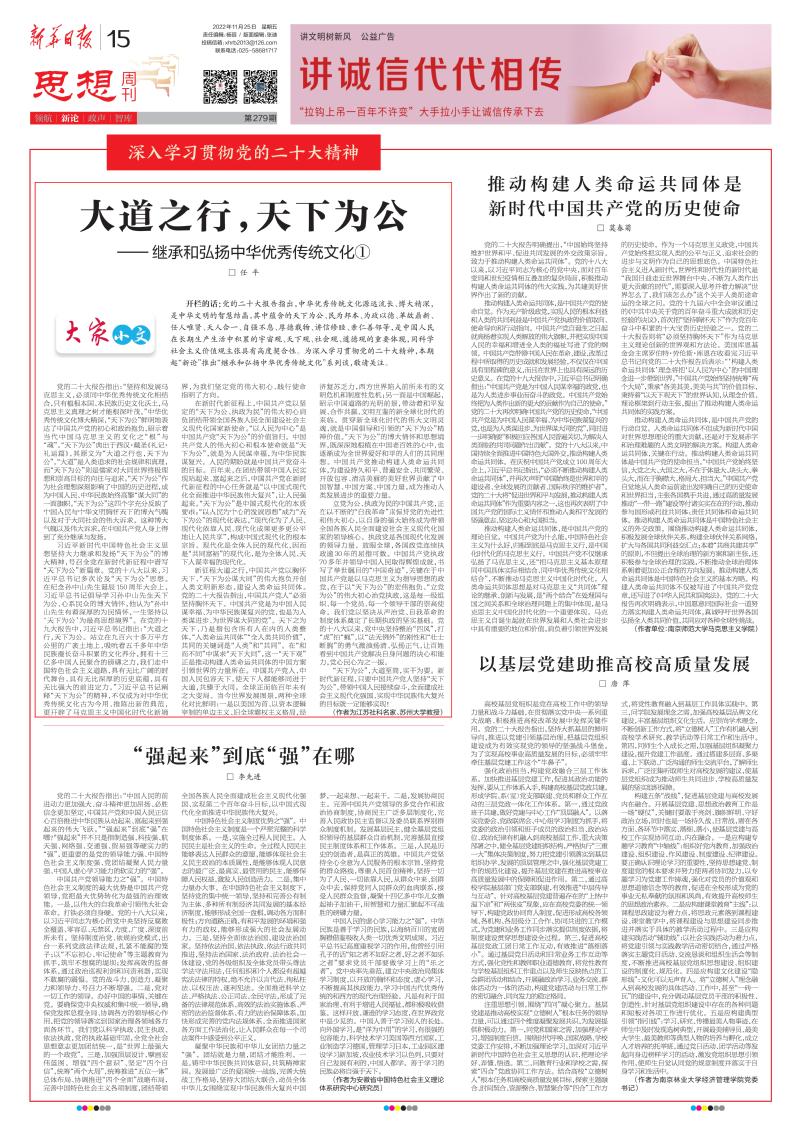 开栏的话:党的二十大报告指出,中华优秀传统文化源远流长、博大精深,是中华文明的智慧结晶,其中蕴含的天下为公、民为邦本、为政以德、革故鼎新、任人唯贤、天人合一、自强不息、厚德载物、讲信修睦、亲仁善邻等,是中国人民在长期生产生活中积累的宇宙观、天下观、社会观、道德观的重要体现,同科学社会主义核心价值观主张具有高度契合性。为深入学习贯彻党的二十大精神,本期起“新论”推出“继承和弘扬中华优秀传统文化”系列谈,敬请关注。